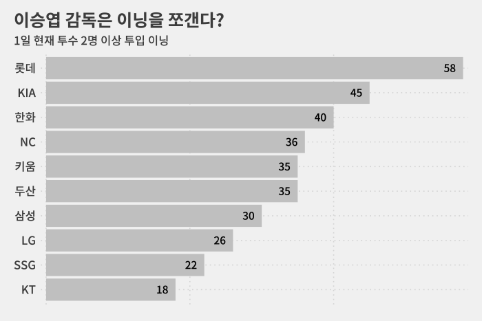 다만, 적어도 올 시즌에는, 이 감독이 투수를 많이 쓴 경기가 유독 많다고 할 수는 없습니다.