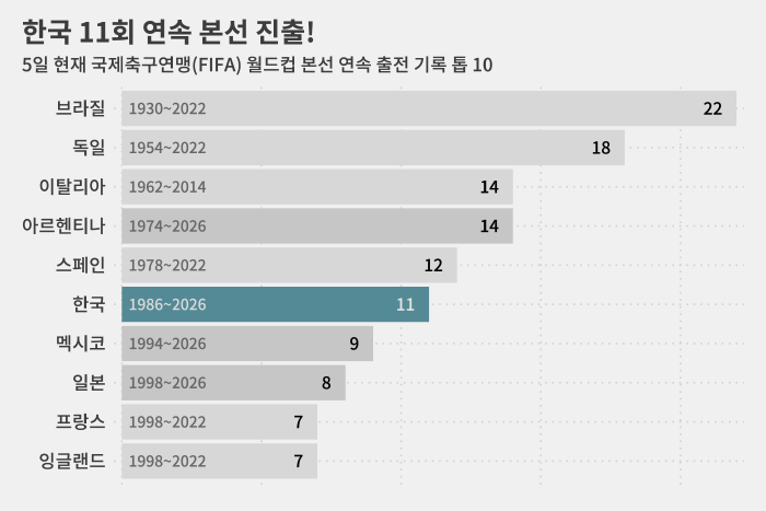 한국은 이날 이라크 방문 경기에서 2-0 완승을 거두고 B조 1위(승점 19·5승 4무)로 11회 연속 본선 진출을 확정했습니다.